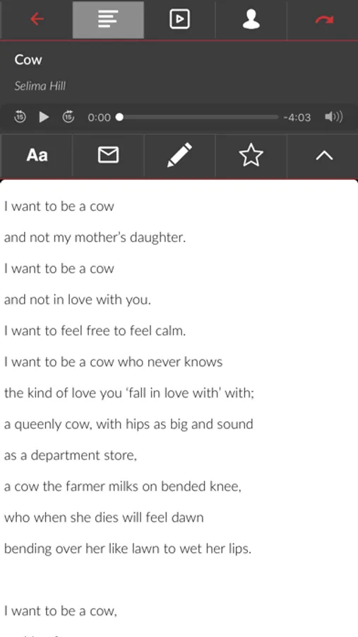 After reading, listening to, or watching a poem, the app currently allows you to share poems and recommendations via social media and email, add the poet to your Favourites list, or tag the poem with themes. You can also change how the poem appears on the screen using the Display option.