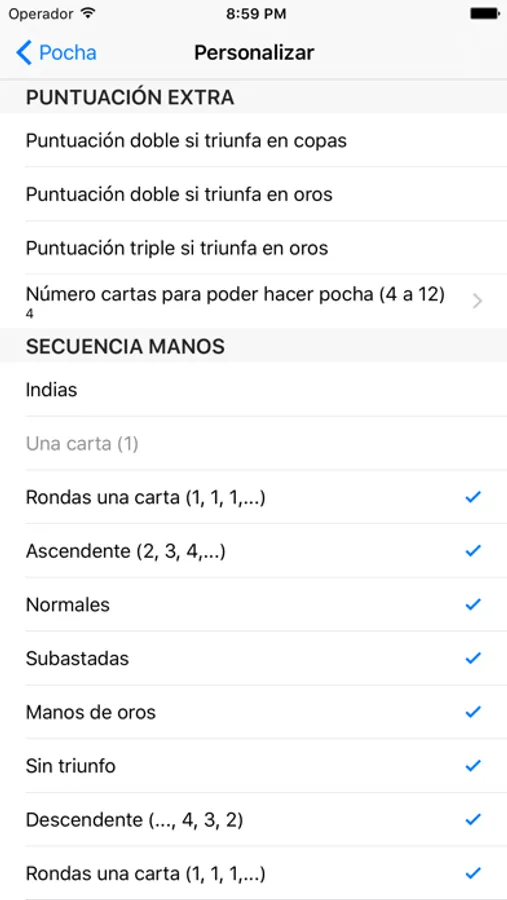 - Secuencia manos: Se puede definir de cuantas manos y de que tipo consta la partida: Una carta, ascendentes, normales, descendentes y manos especiales