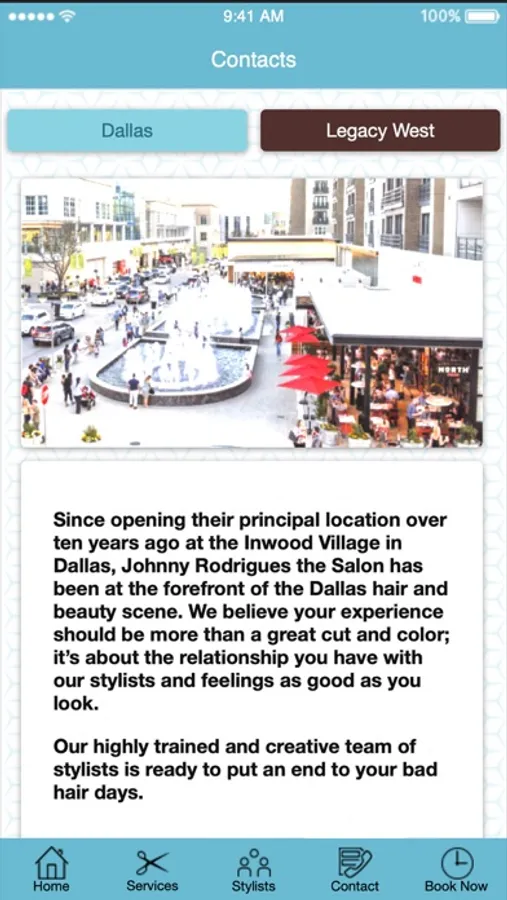 As soon as guests walk though the door, they're greeted like family and offered a beverage. Each of our highly-trained stylists and colorists are skilled in personalizing each client's service based on his or her vision, lifestyle, hair type, face shape and skin tone. We don't believe in one-size-fits-all cuts, color or styles. While some other salon experiences start and end with the appointment, we specialize in giving clients the support and skills they need to maintain their looks at home through extensive client class offerings. Finally, it's our hope that your experience with us will lead you to share the Johnny Rodriguez name with friends, family and even strangers (who are bound to stop you and ask who does your hair!).