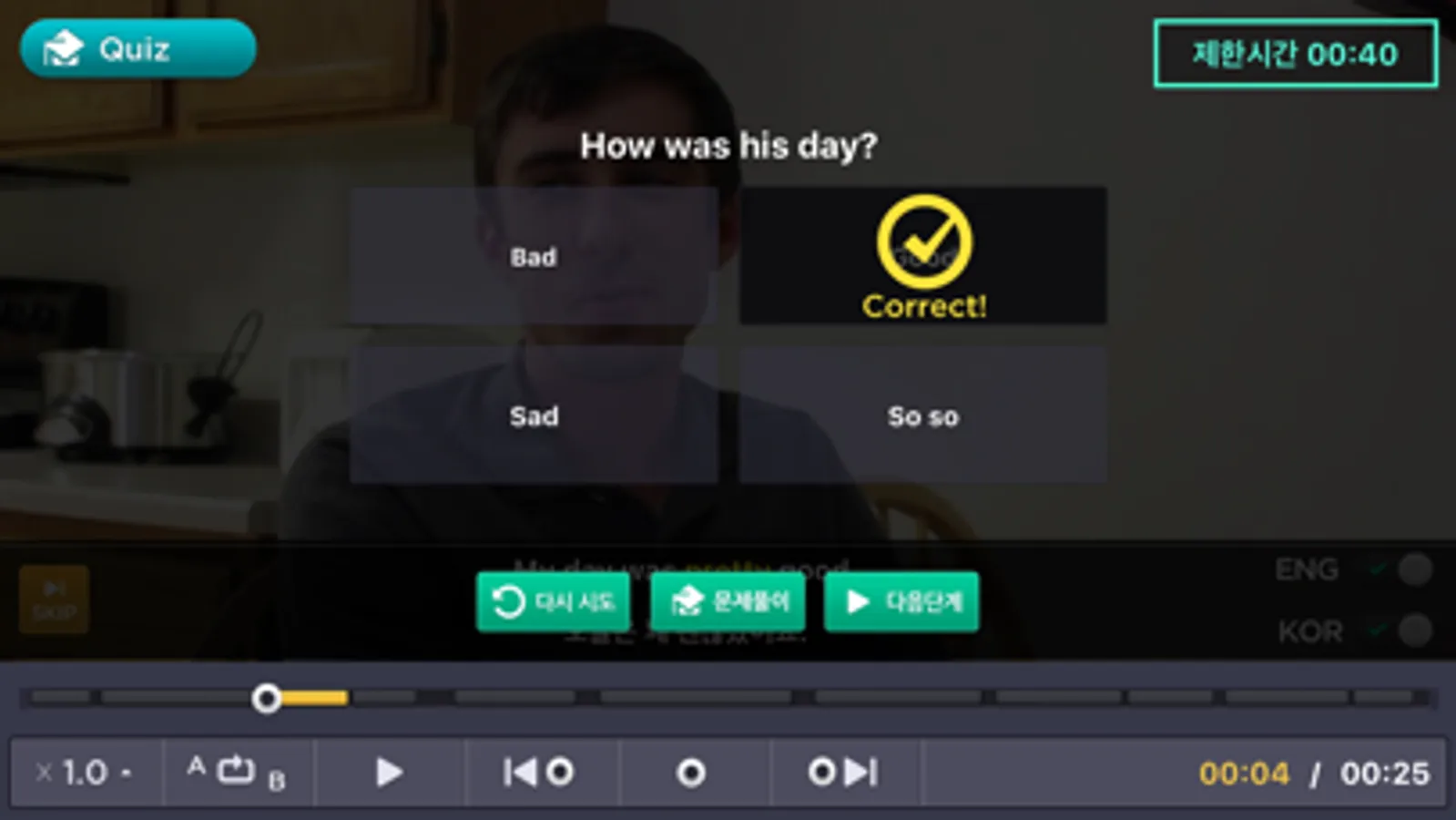 원어민의 대화 내용에 관련된 퀴즈를 풀어봄으로써 학습 이해 정도를 손쉽게 재점검합니다.