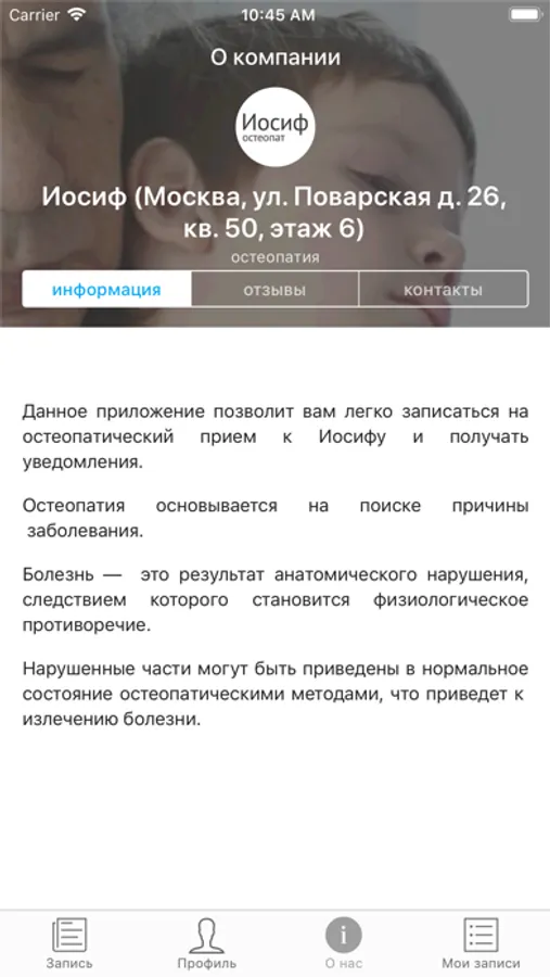 Данное приложение позволит вам легко записаться на остеопатический прием к Иосифу и получать уведомления.