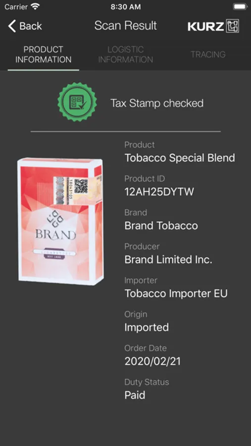 TRUSTCONCEPT TAX STAMPS is a web-based authentication, information and communication system that connects the real world to the virtual. TRUSTCONCEPT TAX STAMPS designates visual authentication elements that are linked to a comprehensive database. Depending on authorities’ needs, the database contains product information for end users, data of product movements of excisable goods, and product validation data for customs. The data linked to the optical signs can be read by smartphones with a customized app.