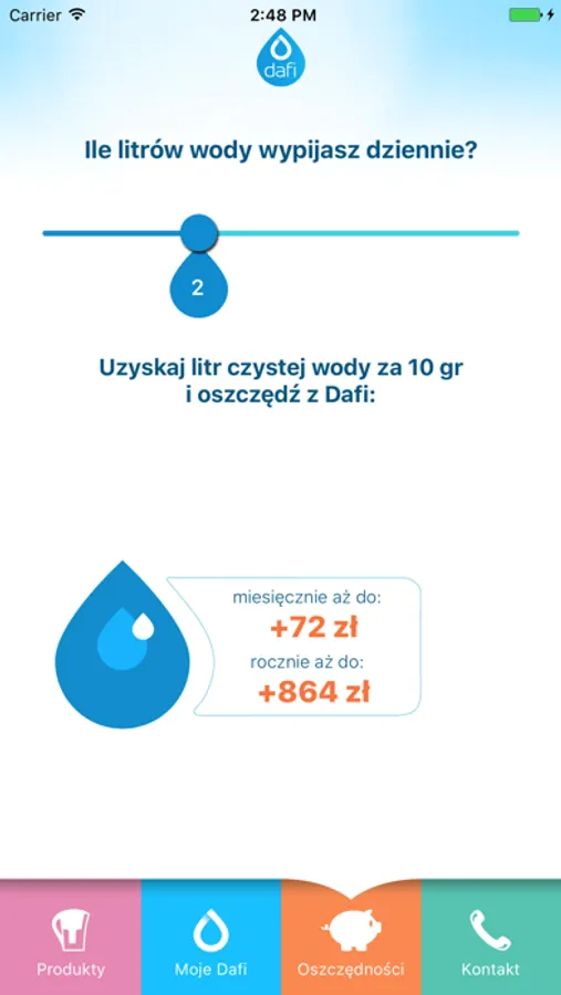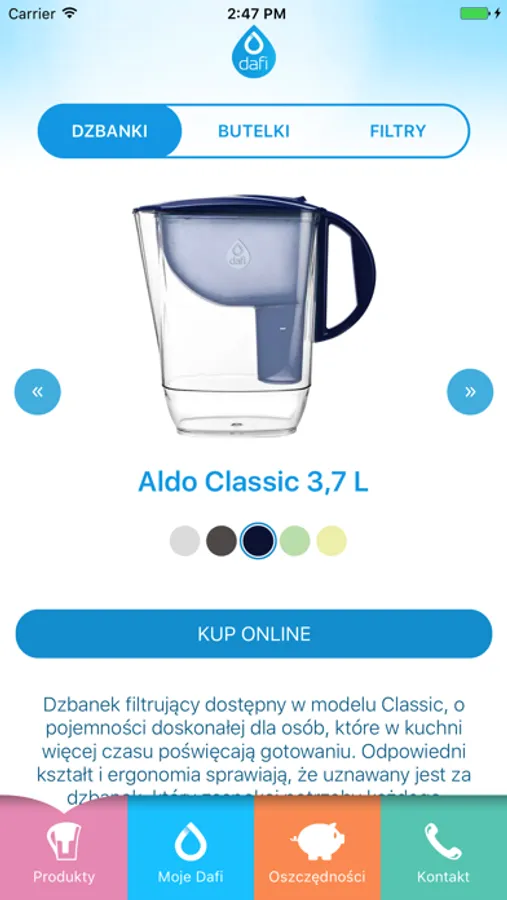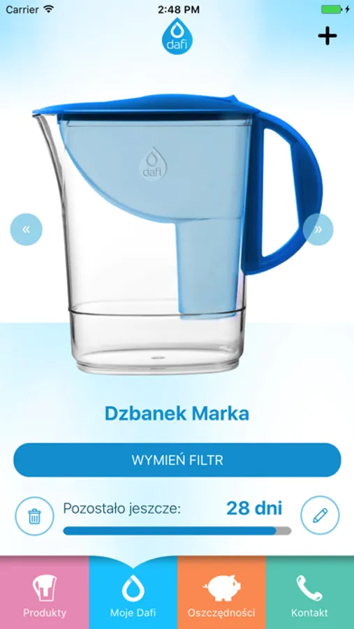 Convenient calendar, located in the application, allow you to set the first day of using the filter. From this moment My Dafi application start counting the time left for the next replacement. My Dafi application inform You about the status of Your filter in three different colour schemes. Blue Dafi drop mean that Your filter is good. Yellow drop inform, that it comes the time of replacing the filter for the new one. Red drop indicate the filter should be changed immediately. With this application you will find out how much you save per month and how much you can save per year by filtering tap water with Dafi. The application provide an overview of products from the current selling offer.