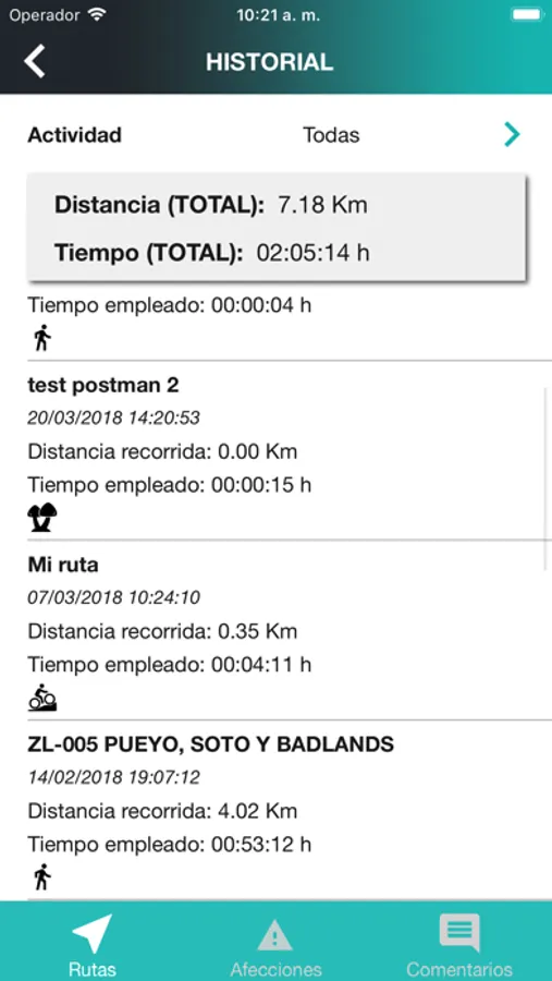 - History of routes made by the user, classified by activity type, history of conditions and comments made by the user.
