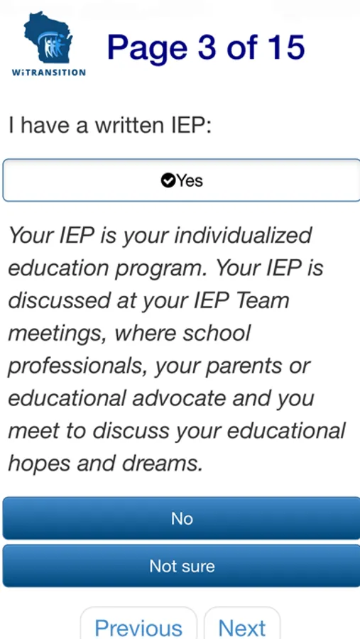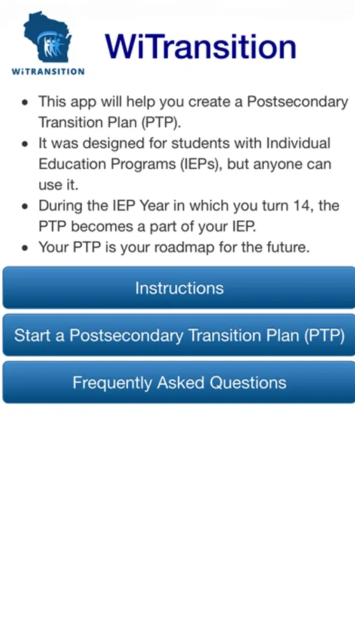 This app is intended to serve as a guide to Wisconsin students, family members, and educators during the transition planning process. It is based on the requirements of the Individuals with Disabilities Education Act IDEA - http://tinyurl.com/jcvoaz3. As a Wisconsin student with a disability who may be turning 14 years or older, or a family member of a transition age student, this app can help prepare for the Individualized Education Program (IEP) meeting where transition planning will be discussed and the Postsecondary Transition Plan (PTP) will be created. Individuals residing outside of Wisconsin may use this free app, but the information needed for transition plans in other states may be different.