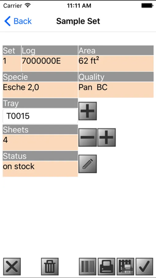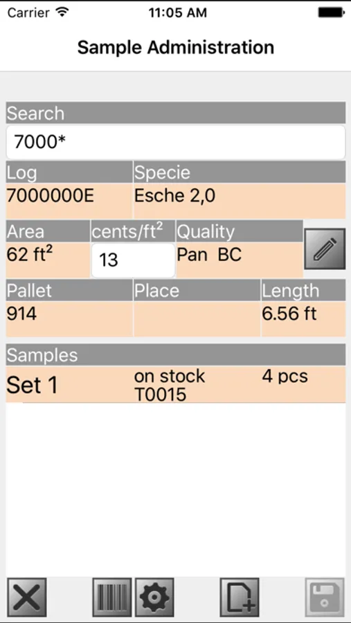 This app serves the purpose of administration veneer samples. Create sample sets for logs and set stock places and status. In addition print barcode labels to identify the samples by scan.