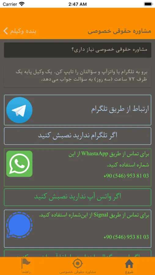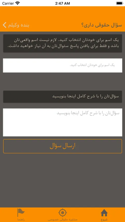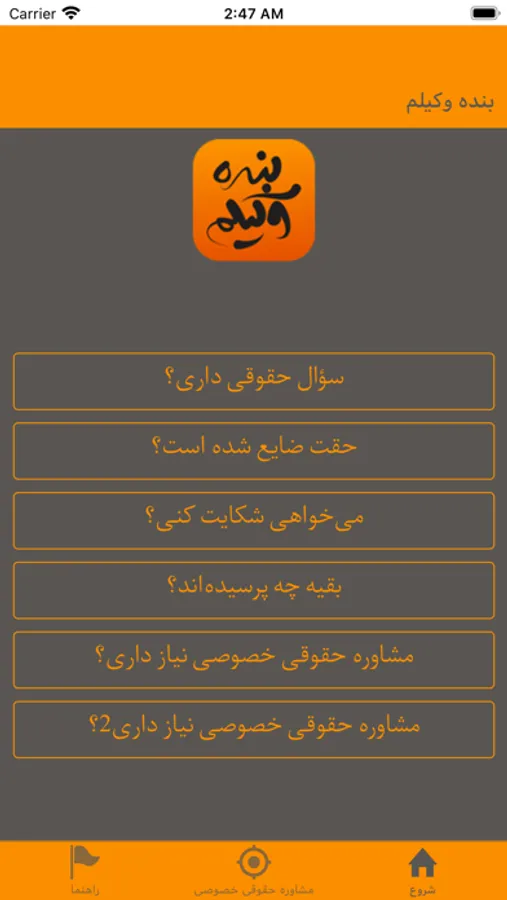 "بنده وکیلم"، یک اپلیکیشن مشاوره حقوقی رایگان است که زیر نظر گروهی از وکلای پایه یک دادگستری اداره میشود. با نصب و استفاده از این اپلیکیشن، همه سئوالهای حقوقی خود، "از شیر مرغ تا جان آدمیزاد" را بپرسید و در عرض ۷۲ ساعت جواب آن را در خود اپلیکیشن بخوانید. برای استفاده از خدمات مشاوره رایگان حقوقی این اپلیکیشن نیازی به ثبت نام یا دادن ایمیل و نام و مشخصات نیست. در صورتی که مشاوره حقوقی خصوصی بخواهید، می توانید از طریق تلگرام یا واتزاپ با وکلای ما در ارتباط باشید. اگر میخواهید شکایتی در مراجع ذیصلاح ثبت کنید، بخش نمونه شکایتهای این اپلیکیشن را ببینید.