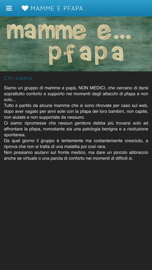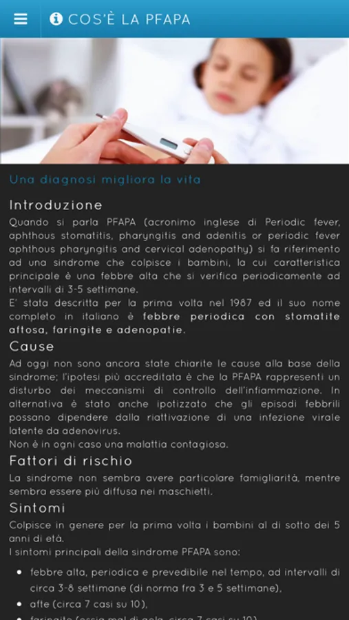 Tramite l'applicazione di mamme e PFAPA scoprirete in modo approfondito cos'è la PFAPA e tutti i suoi aspetti, come arrivare ad una diagnosi, quali sono i maggiori rischi, quali sono le terapie più comuni.