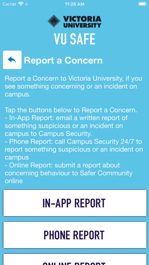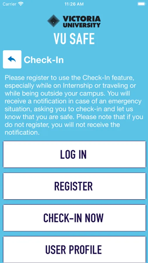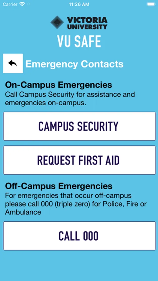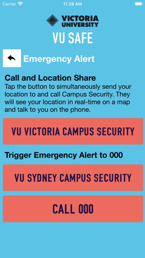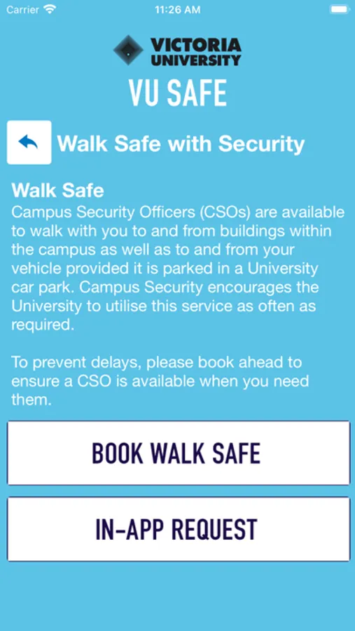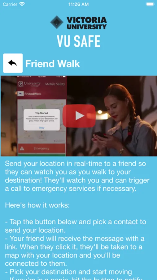 VUSafe is an essential tool to enhance your safety at Victoria University. The app will send you important safety alerts and provide instant access to campus safety resources. VUSafe is the official mobile safety app of Victoria University.