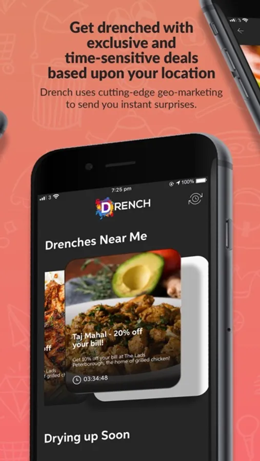 With your permission, we send you geofenced offers (drenches) via push notifications, in real-time. BUT, you have to claim these drenches before they dry up and disappear!