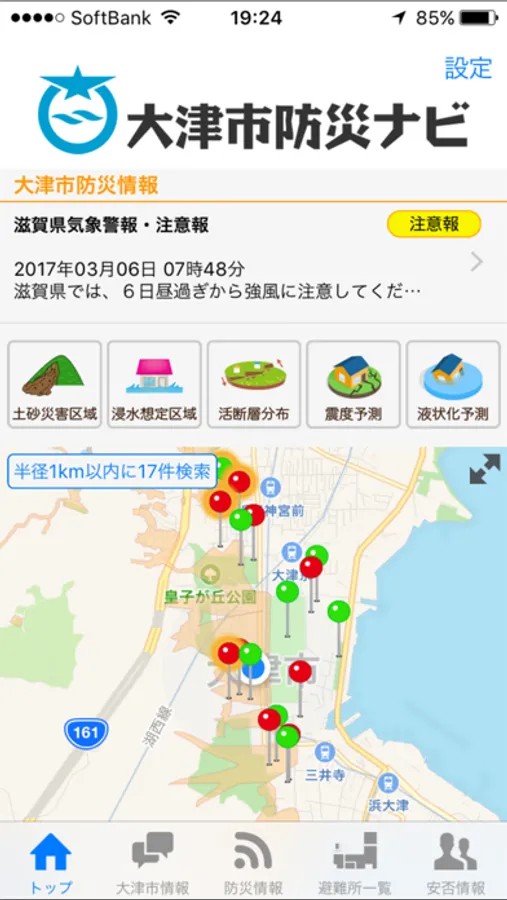 「大津市防災ナビ」は、市内だけではなく市外でも利用でき、一部の機能はオフライン時でも利用できます。