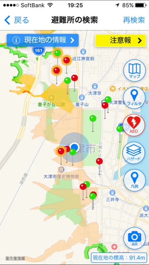 現在地周辺の指定避難所・指定緊急避難場所・AEDの設置場所や詳細が表示され、ARカメラ機能や避難コンパス機能で災害時の避難行動を支援します。