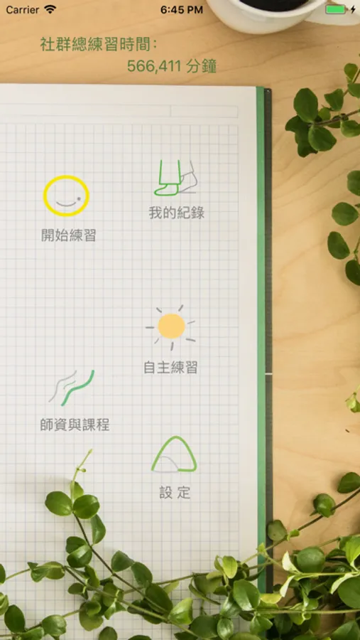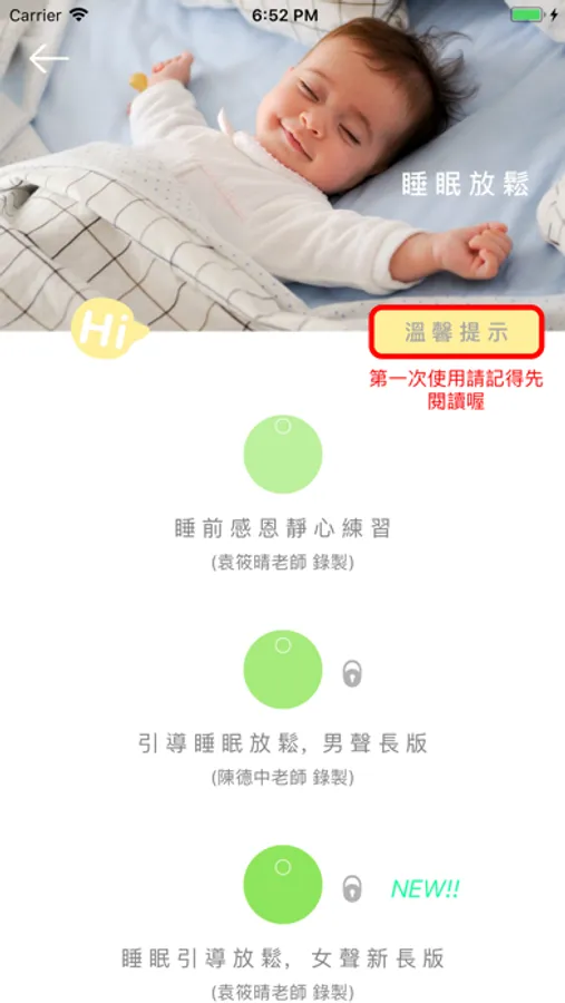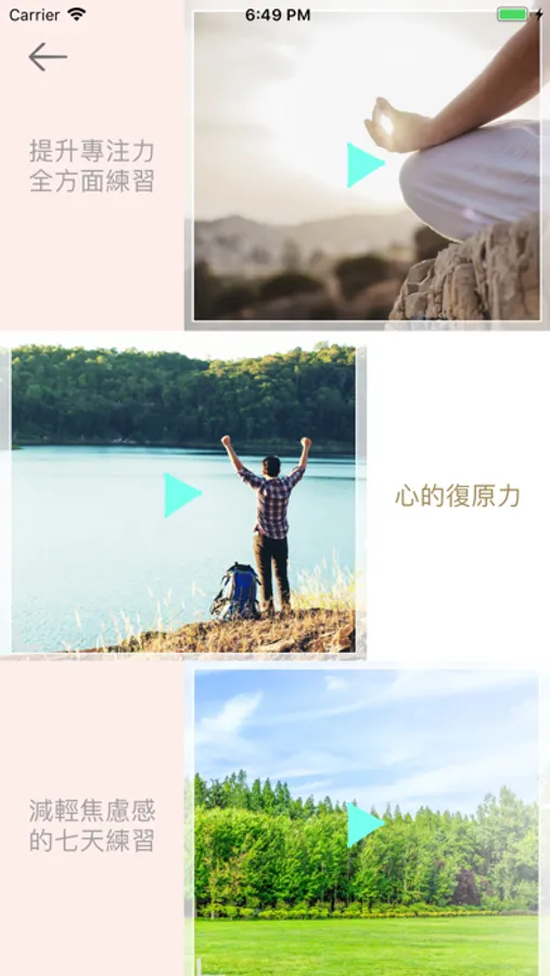 目前免費練習內容包含:正念減壓-5分鐘正念呼吸練習、身體掃描5分鐘靜心版、正念行走練習、正念伸展練習、睡眠引導放鬆-睡前感恩靜心練習。