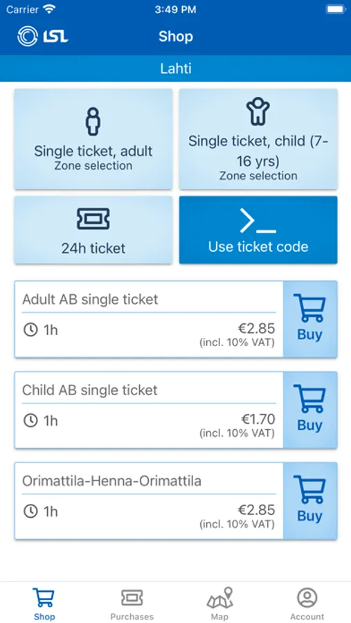 WIth the app you get tickets that are valid in the Lahti region: Lahti, Hollola, Heinola, Orimattila, Asikkala and Padasjoki.