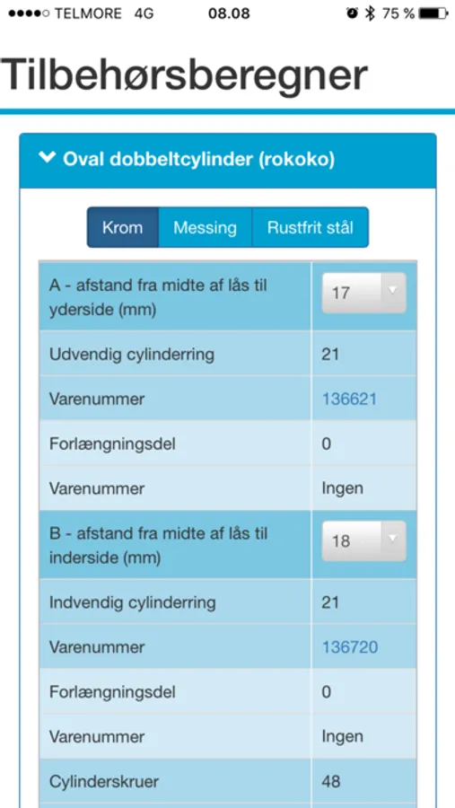 Derefter skal du angive din dørs A- og B mål. Når de er angivet, så vil du få vist en huskeliste med hvilket tilbehør der skal købes til låsen.