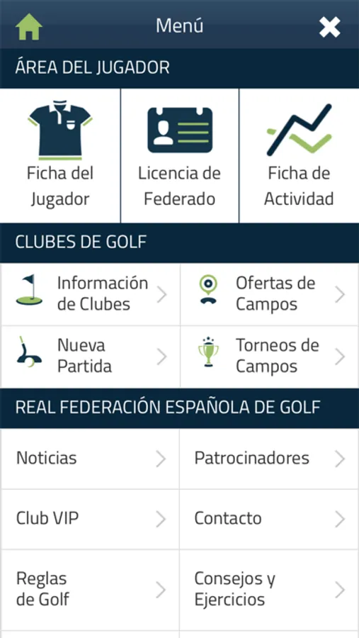 El federado podrá consultar su hándicap, su ficha de actividad, estadísticas de juego e incluso inscribirse a competiciones desde su terminal. Igualmente tiene a su disposición las ofertas de los patrocinadores de la RFEG, así como una completa ficha de todos los campos de España.