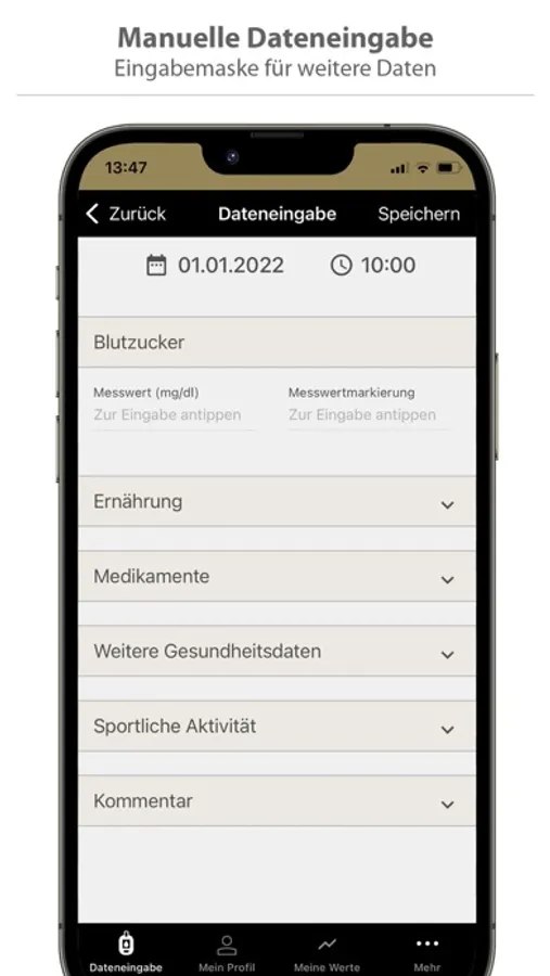 Unter diesem Punkt findet sich eine Eingabemaske, in die Nutzer, neben dem Blutzuckerwert, weitere Daten (wie Ernährung, Medikamente, Blutdruck, Puls, Gewicht, sportliche Aktivitäten) eintragen können.