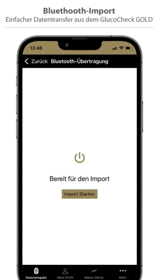 Schneller & unkomplizierter Datenimport via Bluetooth. Um das GlucoCheck GOLD Blutzuckermessgerät mit der App zu verbinden, einfach die letzten vier Zeichen der Geräte-Seriennummer (SN) eintragen und den Import starten.