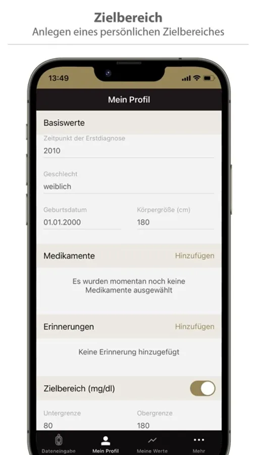 In diesem Bereich kann der User grundlegende Angaben hinterlegen. Dazu gehören sein "Diabetestyp", der "Zeitpunkt der Erstdiagnose", "Geschlecht", "Geburtsdatum" und "Körpergröße".