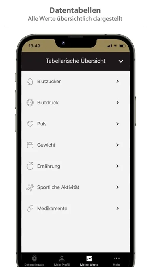 Unter "Meine Werte" werden sämtliche Daten, die in die App eingegeben wurden, in verschiedenen Darstellungsformen abgebildet. Folgende Darstellungsformen können ausgewählt werden: