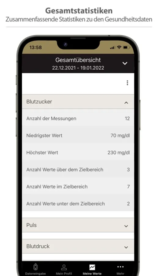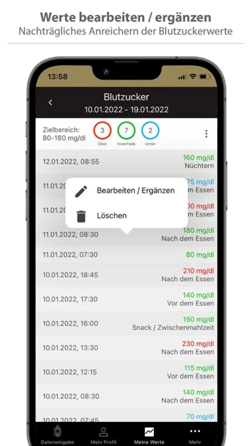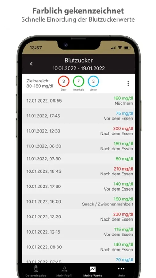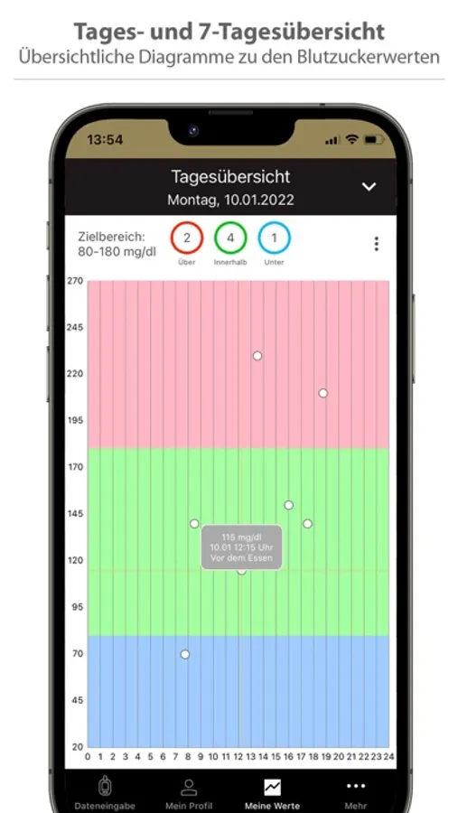 Der Zielbereich (ideale Blutzuckerrange) kann vom Nutzer individuell hinterlegt werden. Wichtig: Kontaktieren Sie zur Ermittlung Ihres individuellen Zielbereiches bitte Ihren behandelnden Arzt.