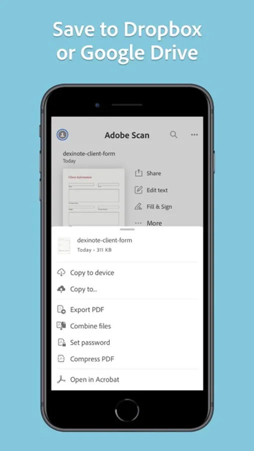 • Quickly scan and save your important documents to Dropbox or Google Drive so you can access and share them wherever you are.
