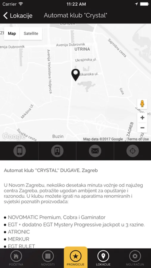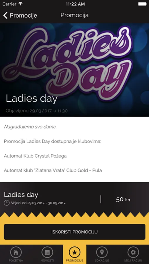 Aplikacija sadrži pregled osnovnih informacija kao što su adresa kluba, radno vrijeme i galerija fotografija pa do naprednih funkcija poput GPS navigacije ili ostvarivanja novčanog promo bonusa.