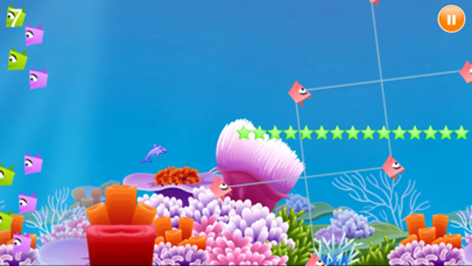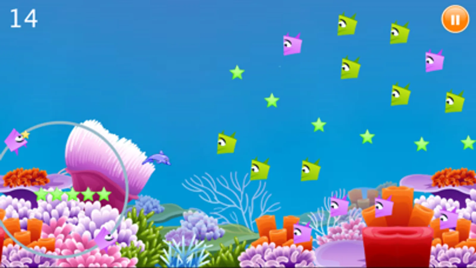 In this game, players only need one finger to manipulate, click on the touch screen, the dolphin will swim up, click continue uphill will continue to swim. Relax your fingers, it will rapidly decline. So the player to control the dolphin swimming straight ahead, then collect stars to get through the barrier.
