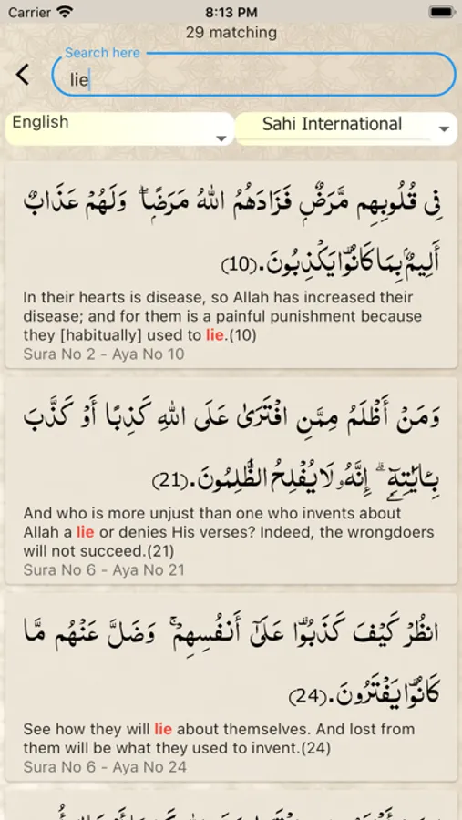 in Typing search you can type any word from any language and App will search that word in whole Quran and will return results of verses includes that word.