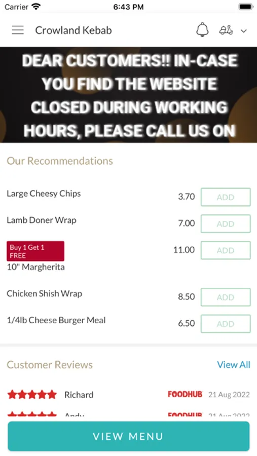 Thank you for visiting Crowland Kebab. We hope you enjoy our online ordering website and your food.