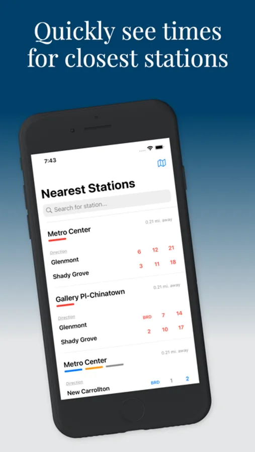 DC Metro is the most convenient, easy to use Capital Region metro app on the market. Make your work commute or visit to the nation's capital simpler. Upon launching the app the metro stations and bus stops are ordered by distance from you. Each station is displaying live data for the next trains and buses. Clicking on a station provides in-depth information on upcoming transit. Built by a DC commuter for DC commuters.