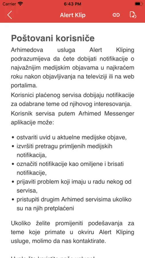 Arhimedova usluga Alert Kliping podrazumijeva da ćete dobijati notifikacije o najvažnijim medijskim objavama u najkraćem roku nakon objavljivanja na televiziji ili na web portalima.