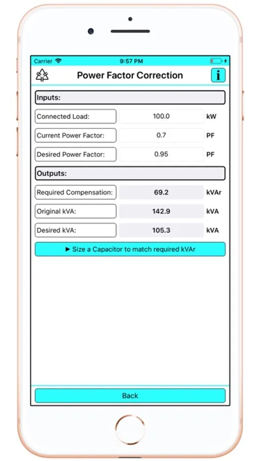 Upon entering the Reactive Power kVAr, the Voltage and Supply Frequency the App calculates the size of capacitor required to achieve the desired kVAr compensation.