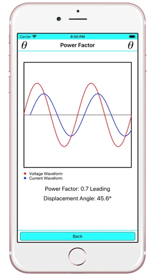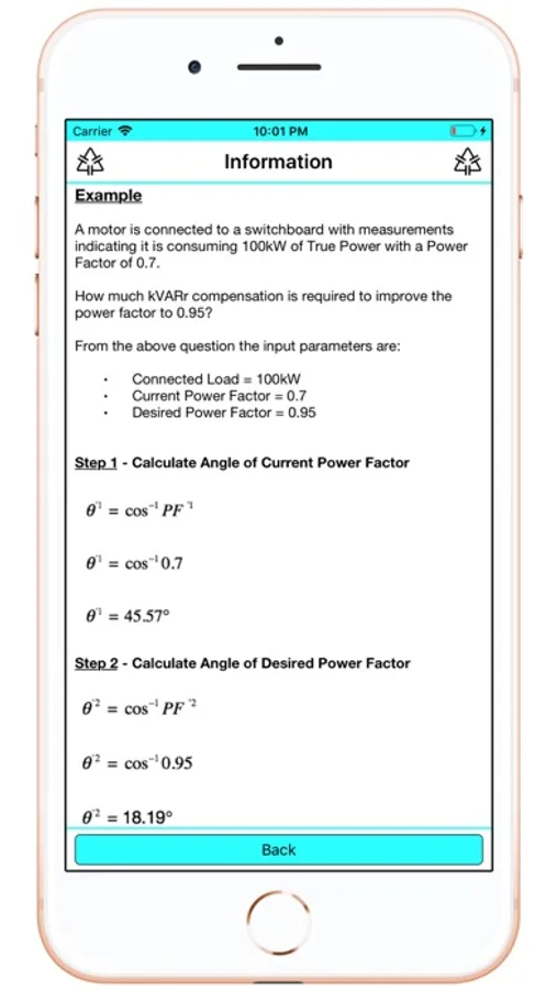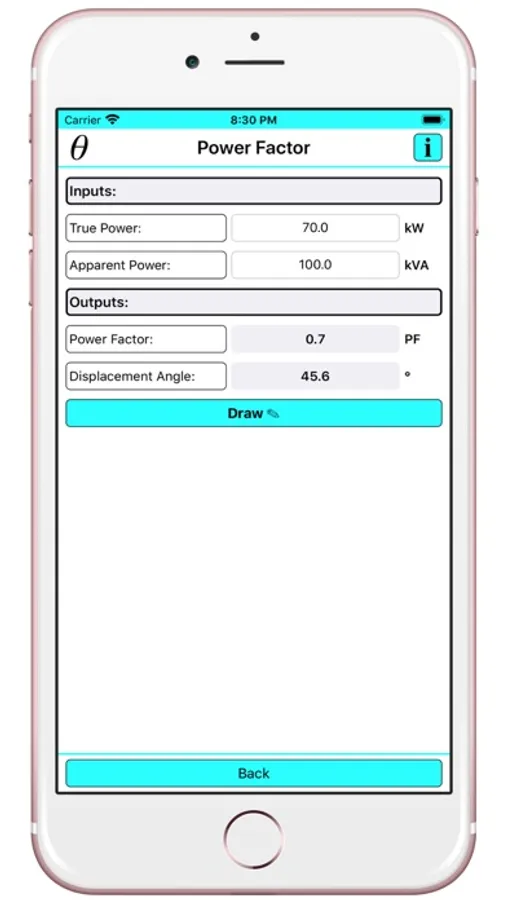 Upon entering the load’s True Power kW and Apparent Power kVA the App calculates the load’s Power Factor and the Displacement Angle between the True Power and Apparent Power.
