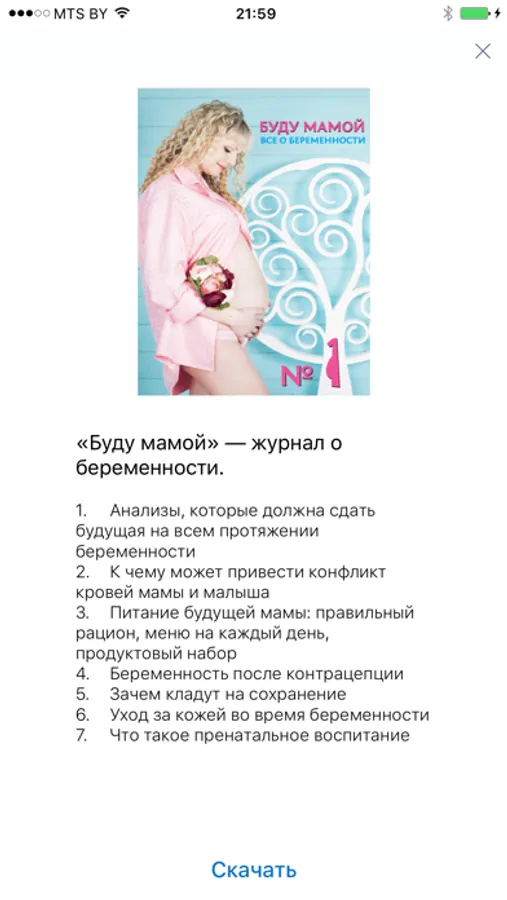 Восемь современных, красочных, информативных журналов для будущих и настоящих мам в одном приложении. Вы платите только за скачивание самого приложения. Все свежие номера получаете бесплатно.