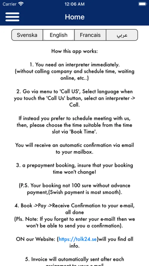 - Book an appointment via website, Alt. app tolk24/7, Alt. smart mobile or (Apple watch) and call directly.