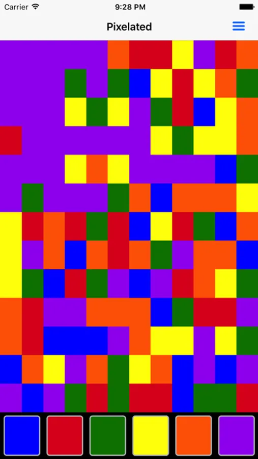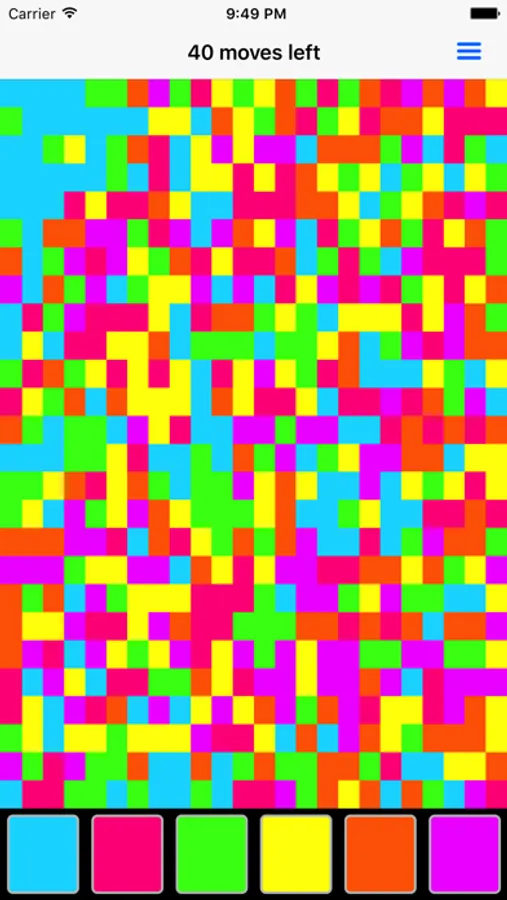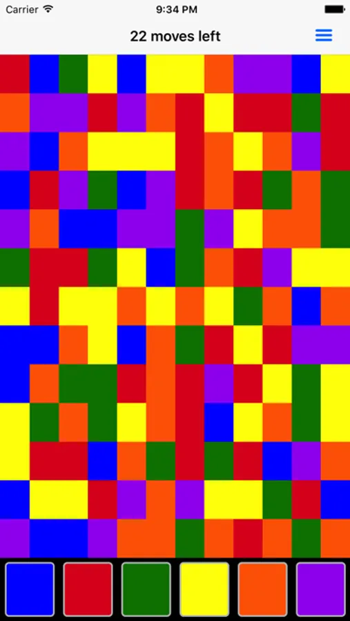 The object of the game is to change the colour of the squares until the entire screen is a single solid colour. This is done by using the coloured buttons on the bottom of the screen to change the colour of the square in the upper left hand corner and those surrounding it. Changing this square to the colour of those around it, allows it to slowly grow until it fills the entire screen. The ultimate goal is to clear the screen in as few moves as possible.