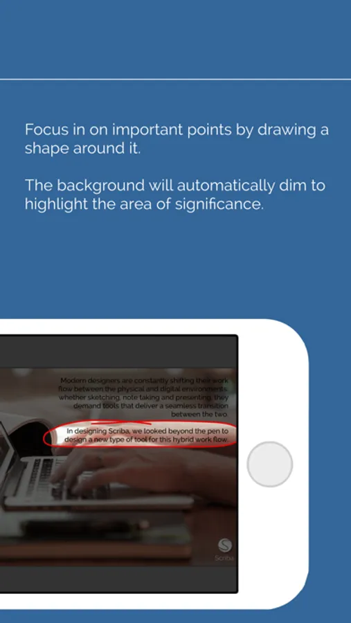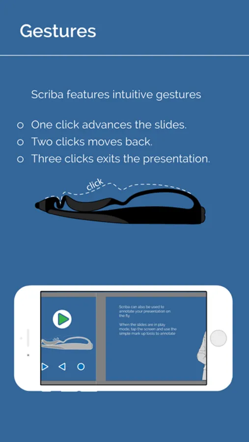Sitting comfortably in the user’s hand, Scriba acts as both a responsive presentation remote and a pressure sensitive stylus. Slides can easily be advanced or rewound with a simple squeeze action and as Scriba is primarily a stylus, slides can be quickly annotated mid-presentation. This unique combination of functionalities make the combination of app and accessory a must have for the anyone that regularly delivers presentations.