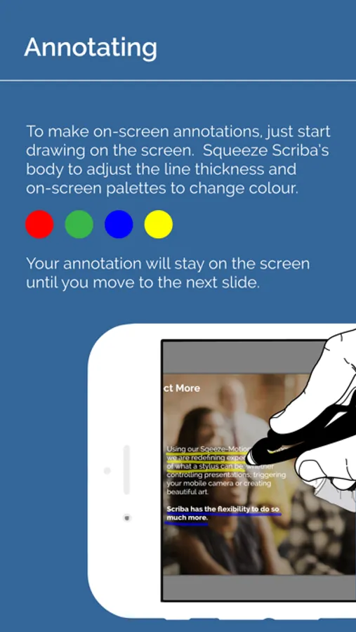 Scriba is much more than just a stylus - it’s a digital multi-tool that provides a diverse range of functionality to the mobile worker. Connected to a mobile device, our unique “Squeeze Motion” technology elevates presentations and storytelling skills to the next level.