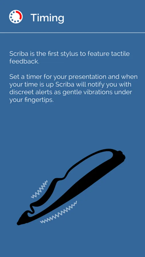 Scriba Slides also helps prevent the user’s presentation from accidentally running over time. Scriba is the first stylus (or presentation remote) to feature haptic feedback providing the user with real-time feedback on the timing of their presentation through patterns of discreet vibrations under their fingertips.