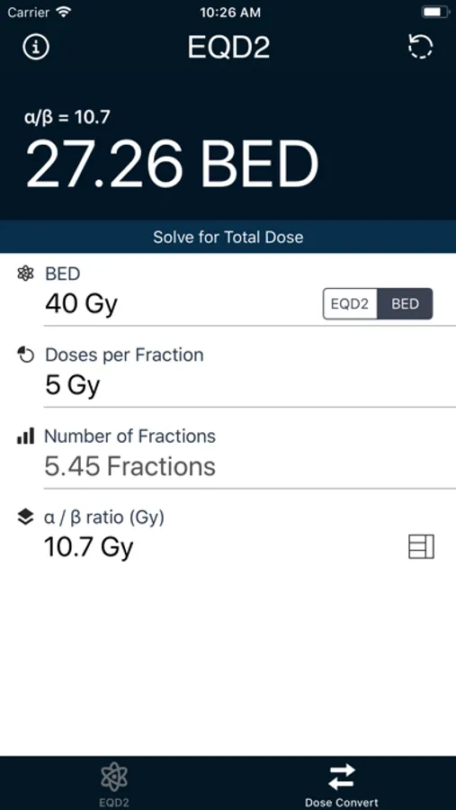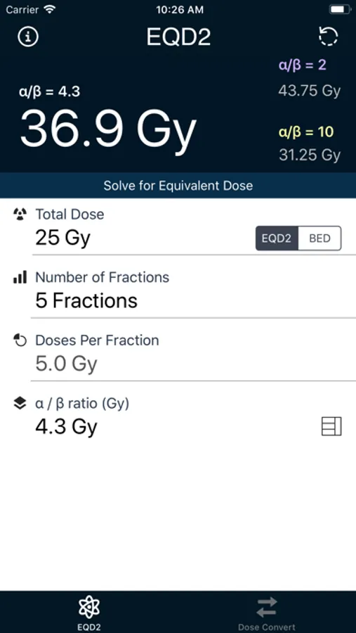 This app features a dose conversion mode in order to calculate a custom dose per fraction.