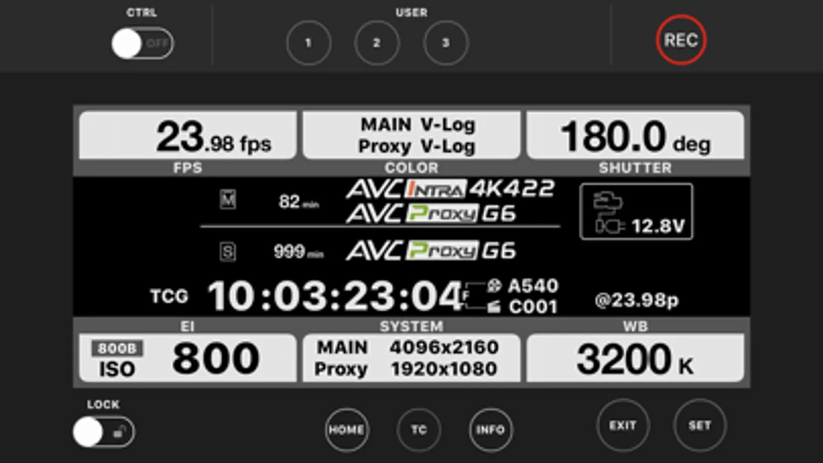 This corresponds to VariCam’s HOME screen. The settings for recording format, etc. can be checked.