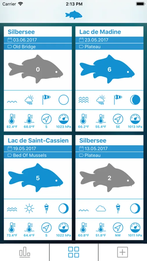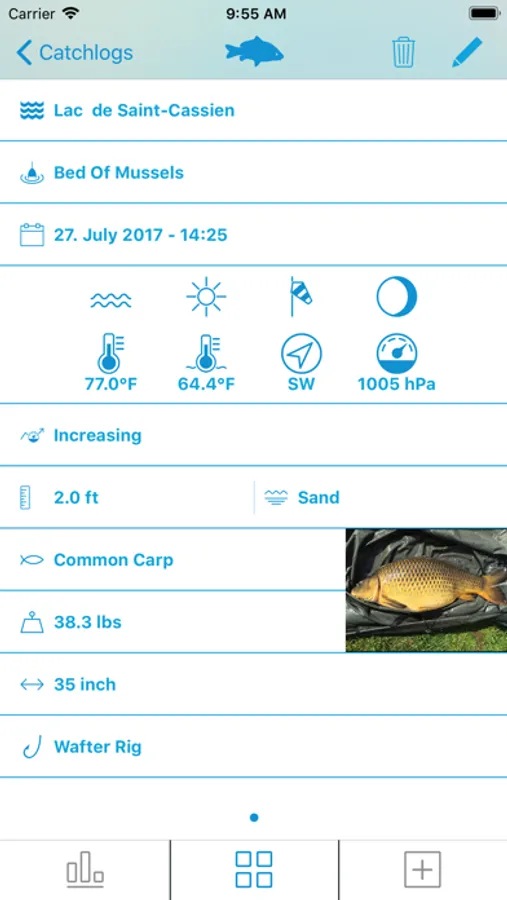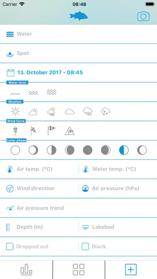 On the basis of water, spot, date and time, water level, weather, wind force, lunar phase, air temperature, water temperature, wind direction, air pressure, species, weight, rig, bait or any other remarks you can analyze your catch success and make the right conclusions when it’s time to be at the water.