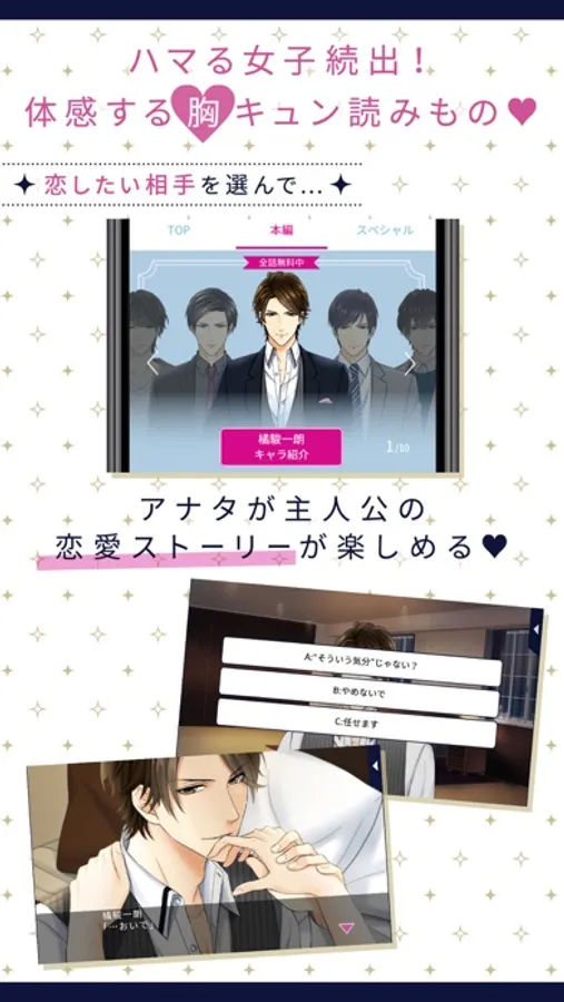 好みのシチュエーション、好みのイケメンを選び、自分が主人公の理想の恋愛ストーリーを体験することができます。