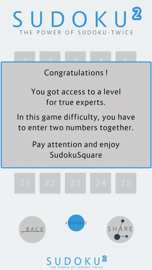 In SudokuSquare you can play with three different difficulties, plus a bonus, the Advanced one. This mode is only accessible after completing a certain number of grids. This is because in the advanced mode, new rules will be introduced, to make the game more and more compelling, and if you know how to play, you will have even more fun.