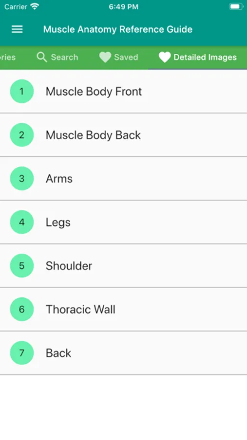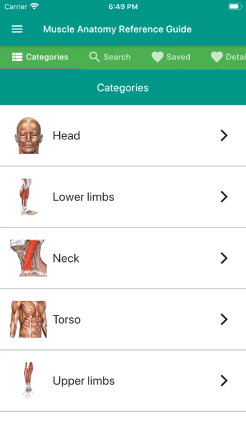 This apps covers information about each muscle in the human body and splits them up into 5 categories: Head, Neck, Torso, Upper Limbs and Lower Limbs.