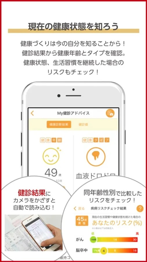 健康診断書にスマホのカメラをかざすだけで、自動的にデータを取得。健康年齢と健康タイプがわかります。