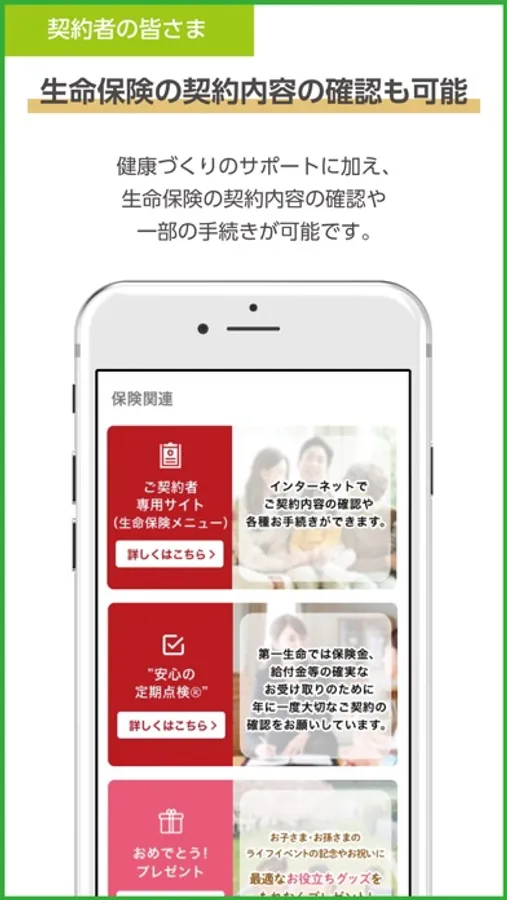 第一生命の契約者とご家族には、健康増進機能が充実した「健康第一」プレミアムがご利用いただけます。