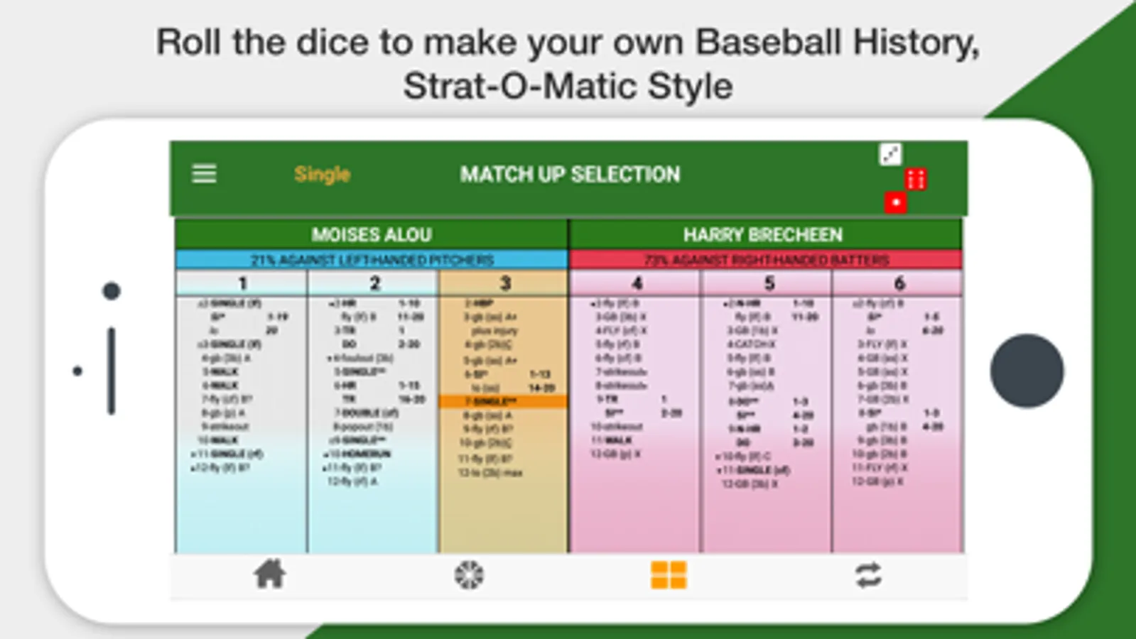 You can match up any two players in history to see their Strat-O-Matic cards and simulate one at-bat or an entire season between the players. Roll the dice, spin the wheel, or hit a button to make your own Baseball history!
