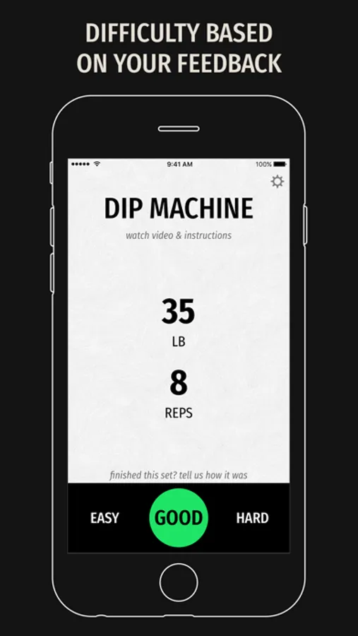 Follow simple exercise instructions and tell us how it went — easy, good, or hard. You don’t have to enter any numbers manually as in the gym log, simply leave a feedback by tapping a button after each set. As the app records your workout progress, difficulty levels (weights and reps) are updated automatically.